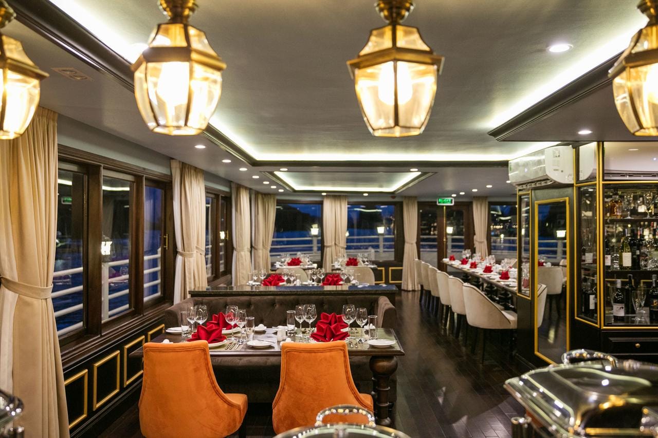 The Athena Cruise is the brand new five-star luxury cruise vessel in Ha Long Bay – Bai Tu Long Bay. Built-in 2016, the Athena Cruise made her maiden voyage on July 1st, 2017. The ship has 3 decks: a lower deck with reception, cabins, and boarding area, a middle deck with cabins, an indoor restaurant and bar, and a rooftop sundeck with open bar, coffee lounge, spa and sauna. Onboard the Athena Cruise there are 21 high-end cabins with 5 different styles available to custom-tailor your voyage with us.