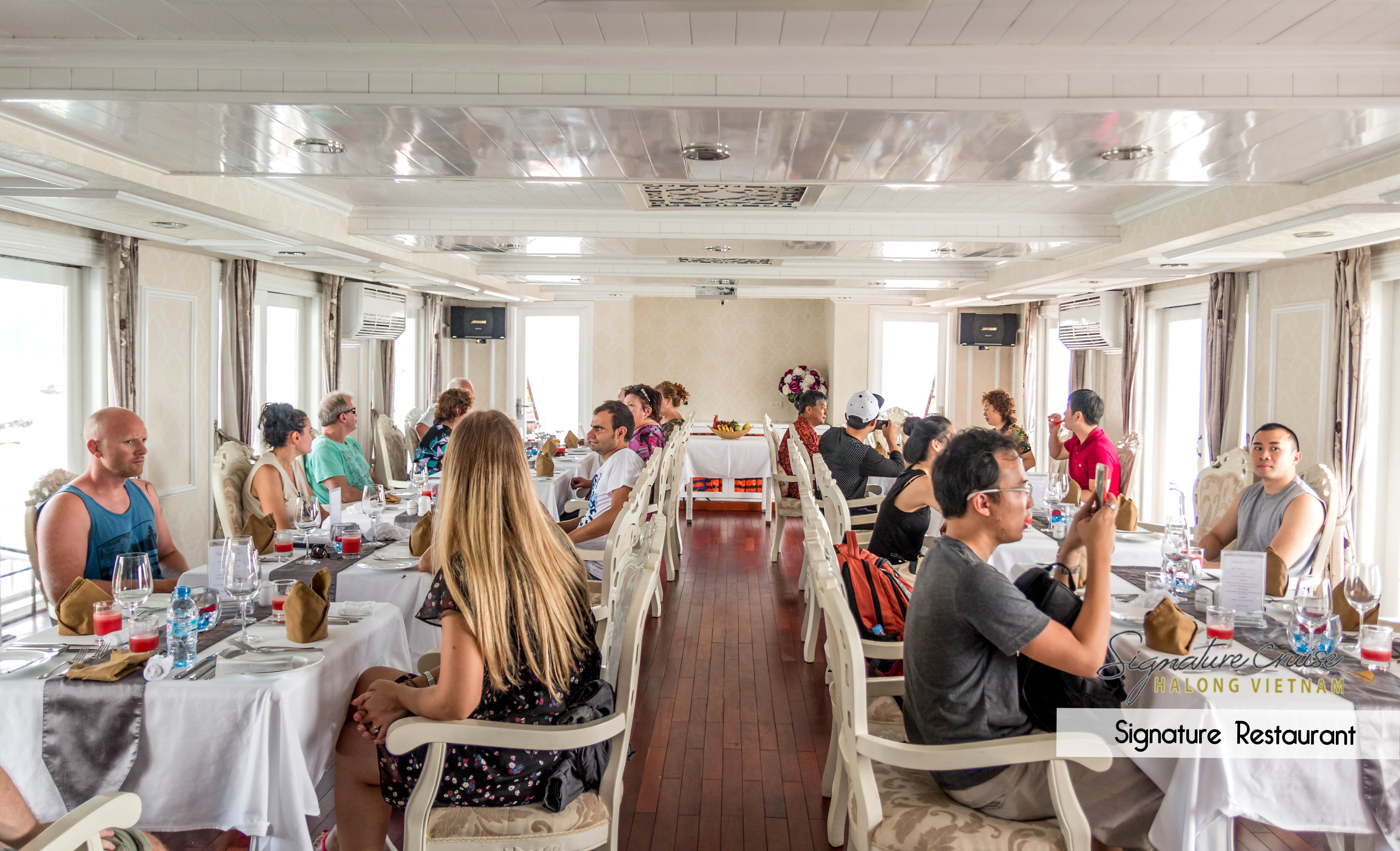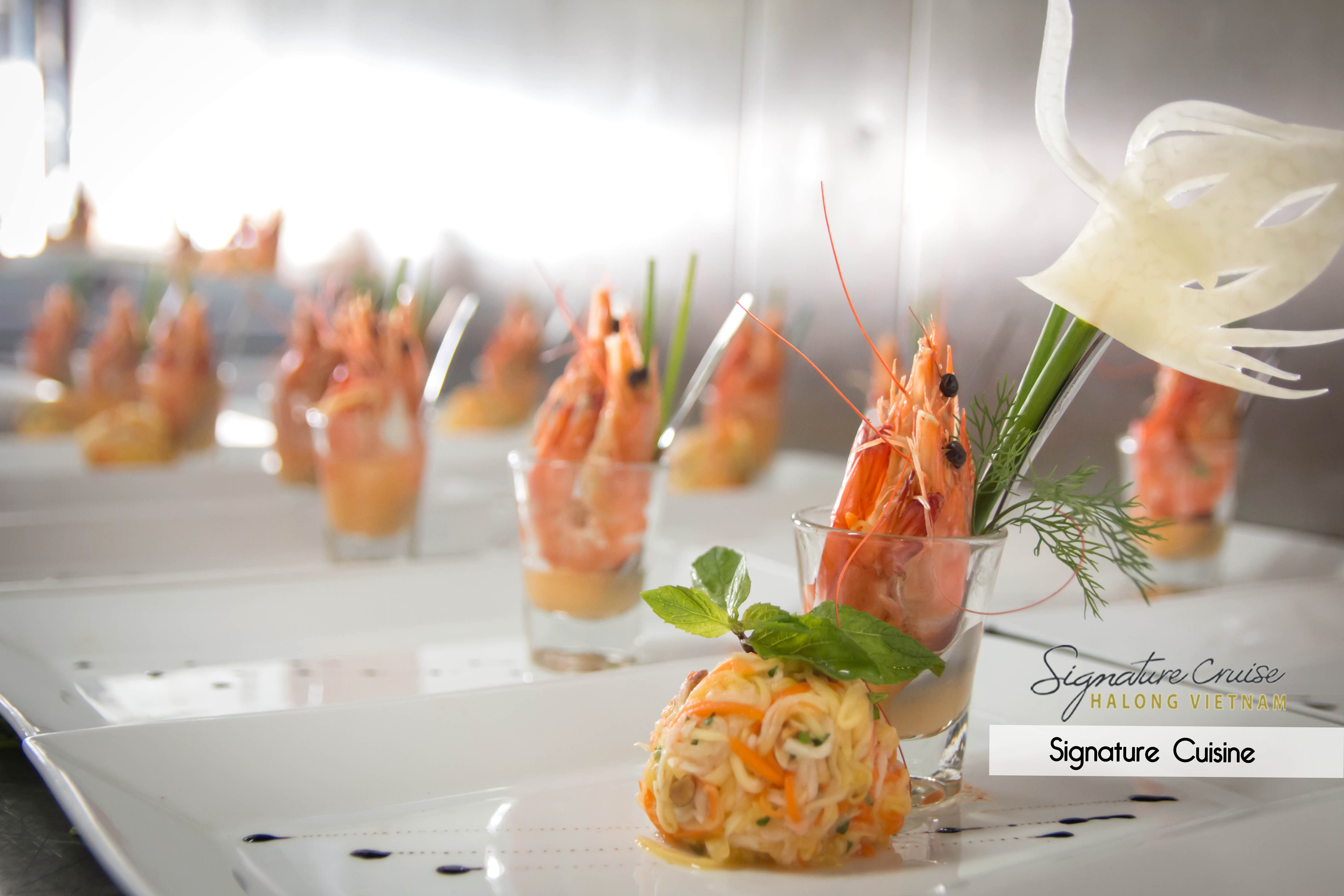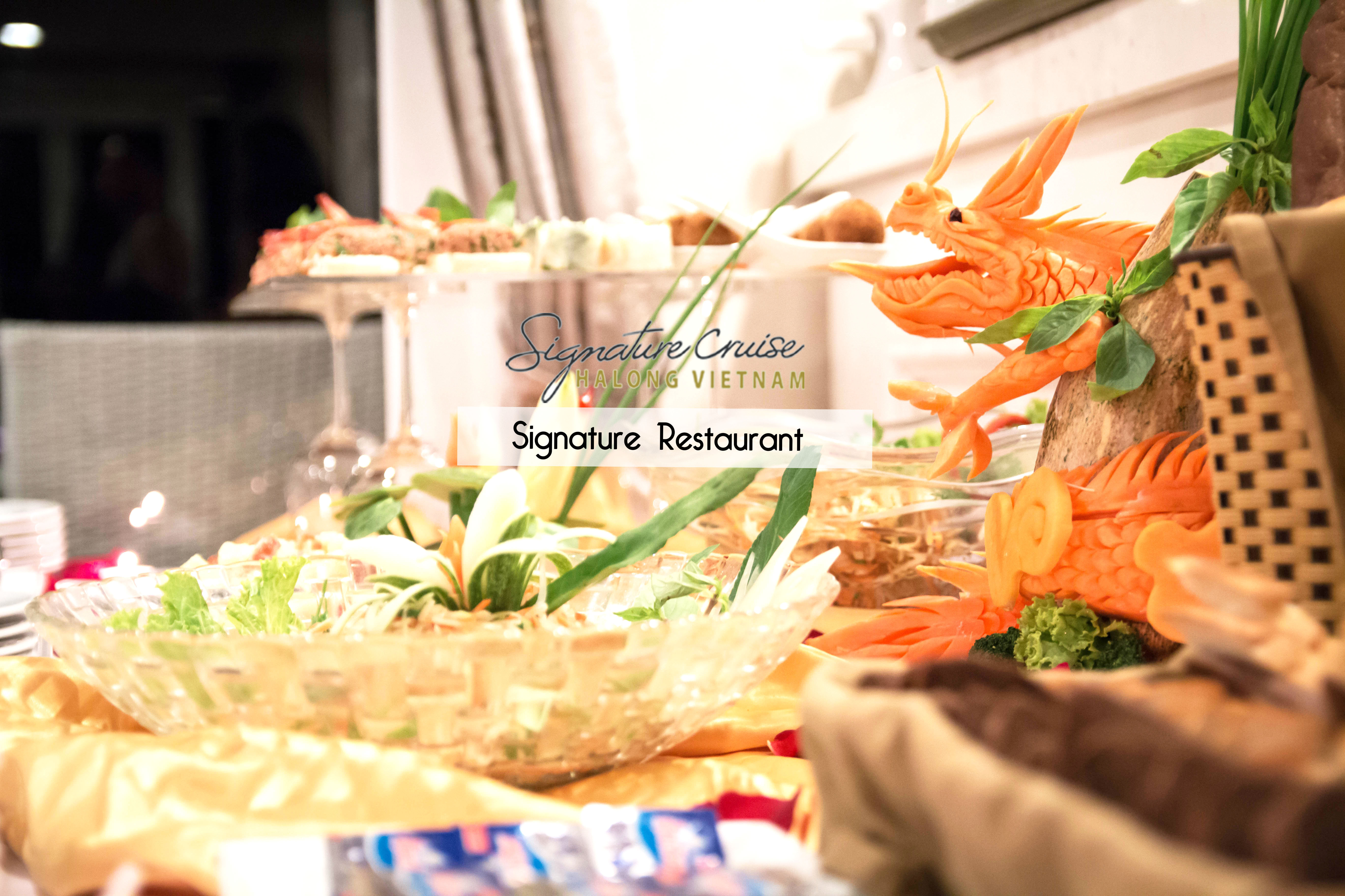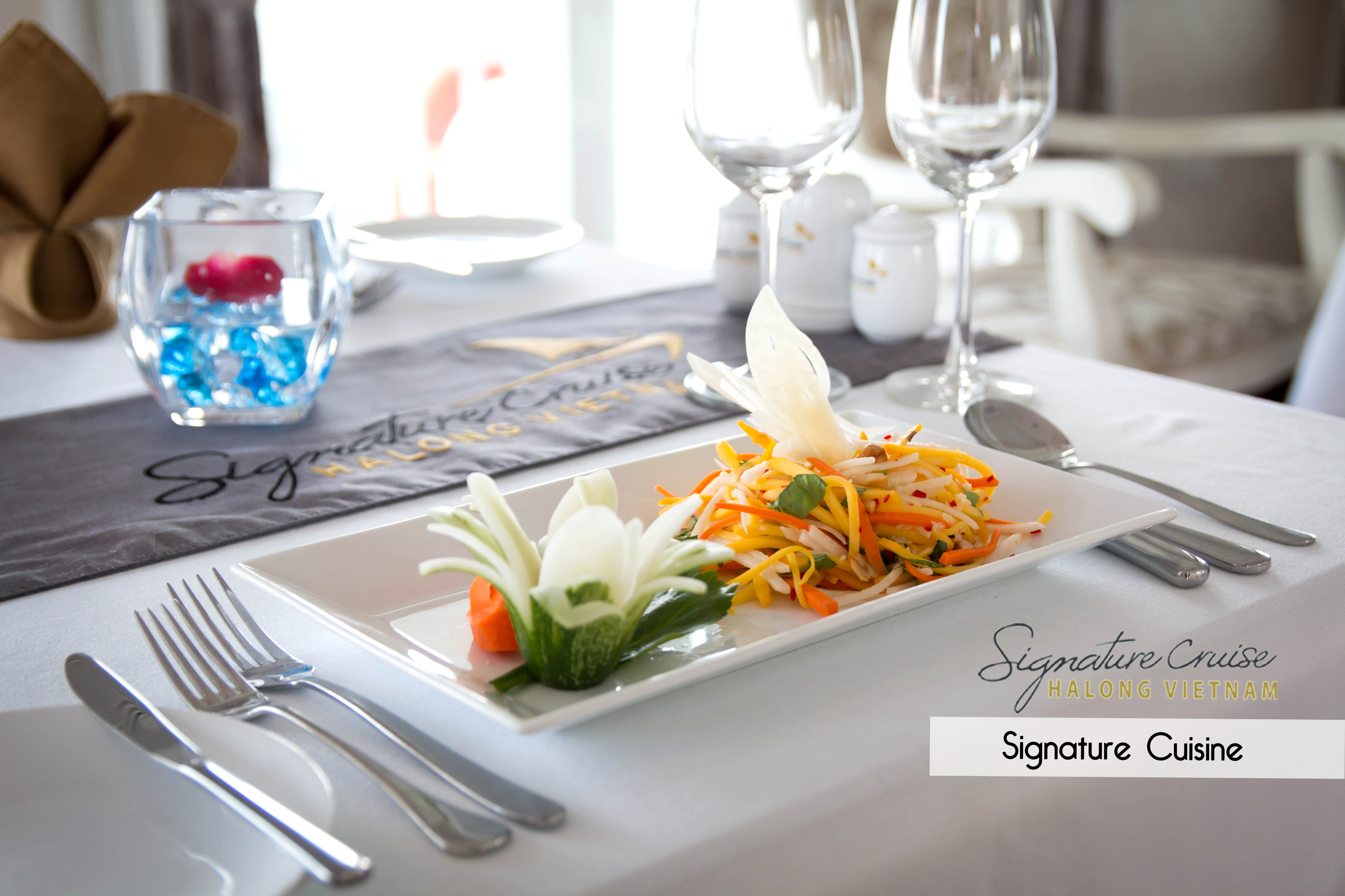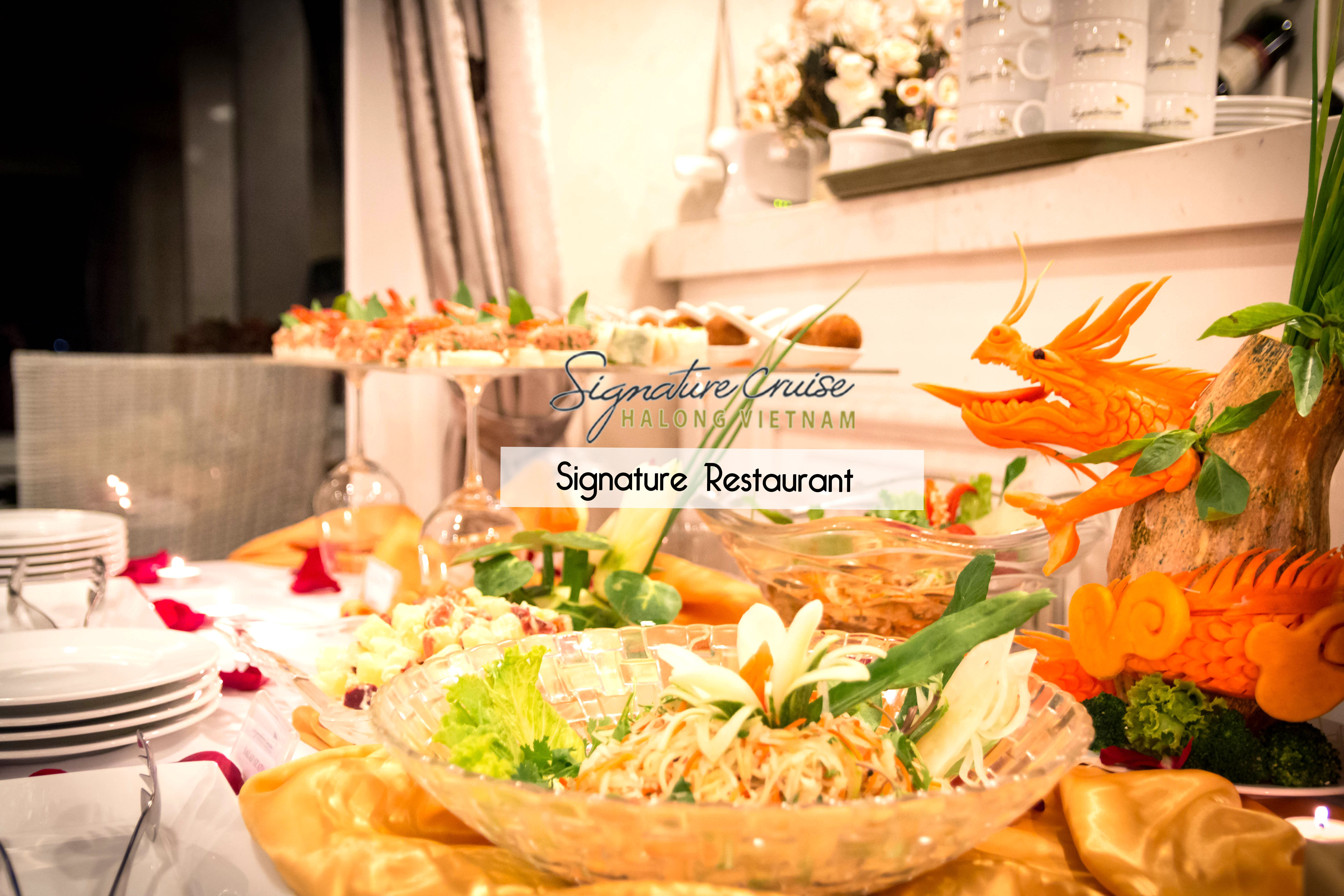 At Signature Halong Cruise, we take pride in offering high-quality facilities and special services to ensure your utmost satisfaction. Prepare to explore the breathtaking landscapes and visit spectacular locations around Halong Bay and Bai Tu Long Bay. Delight your taste buds with tantalizing dishes prepared by our skilled chef and culinary team, featuring fresh seafood, delicious Vietnamese specialties, and international cuisine.