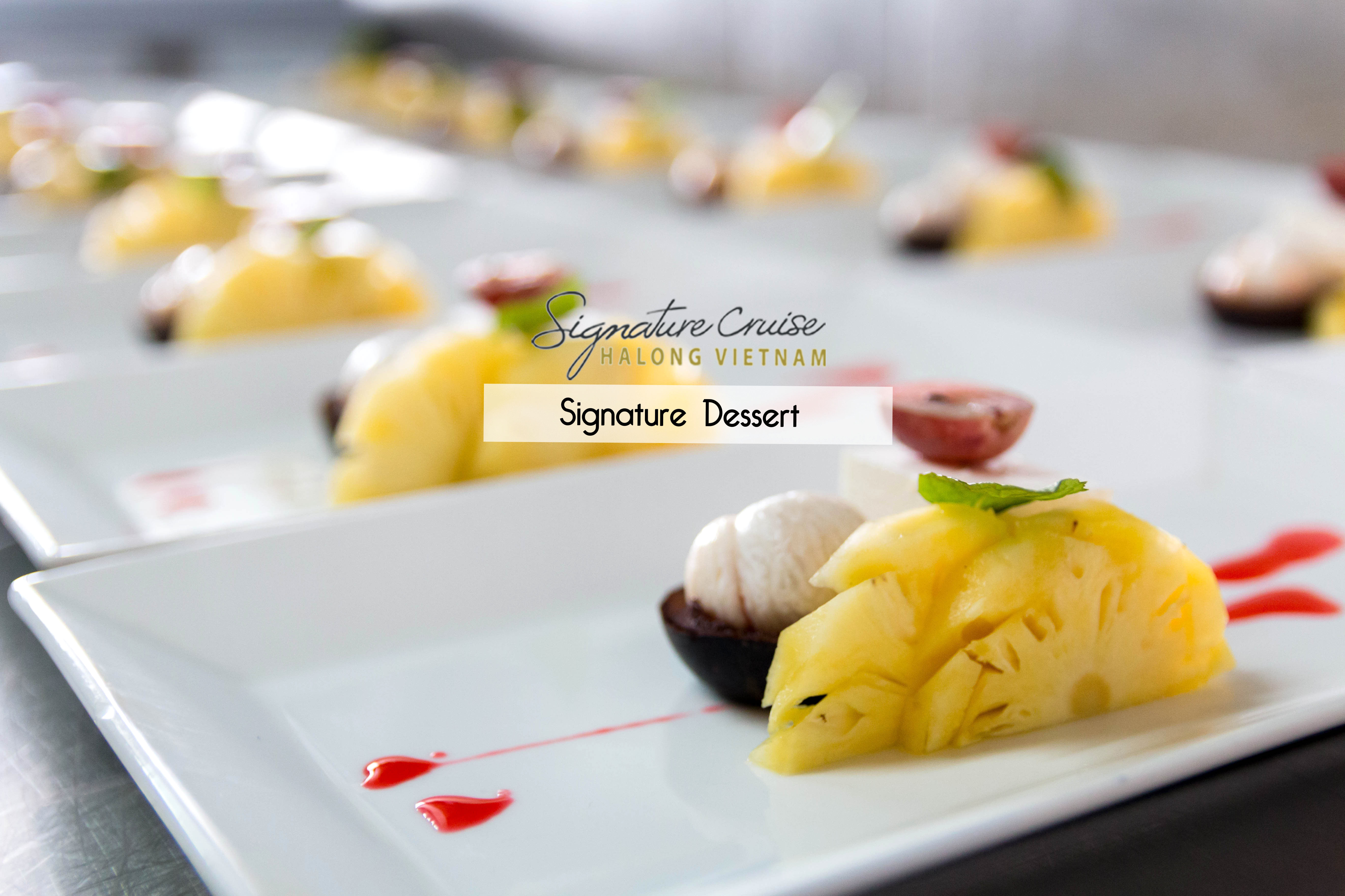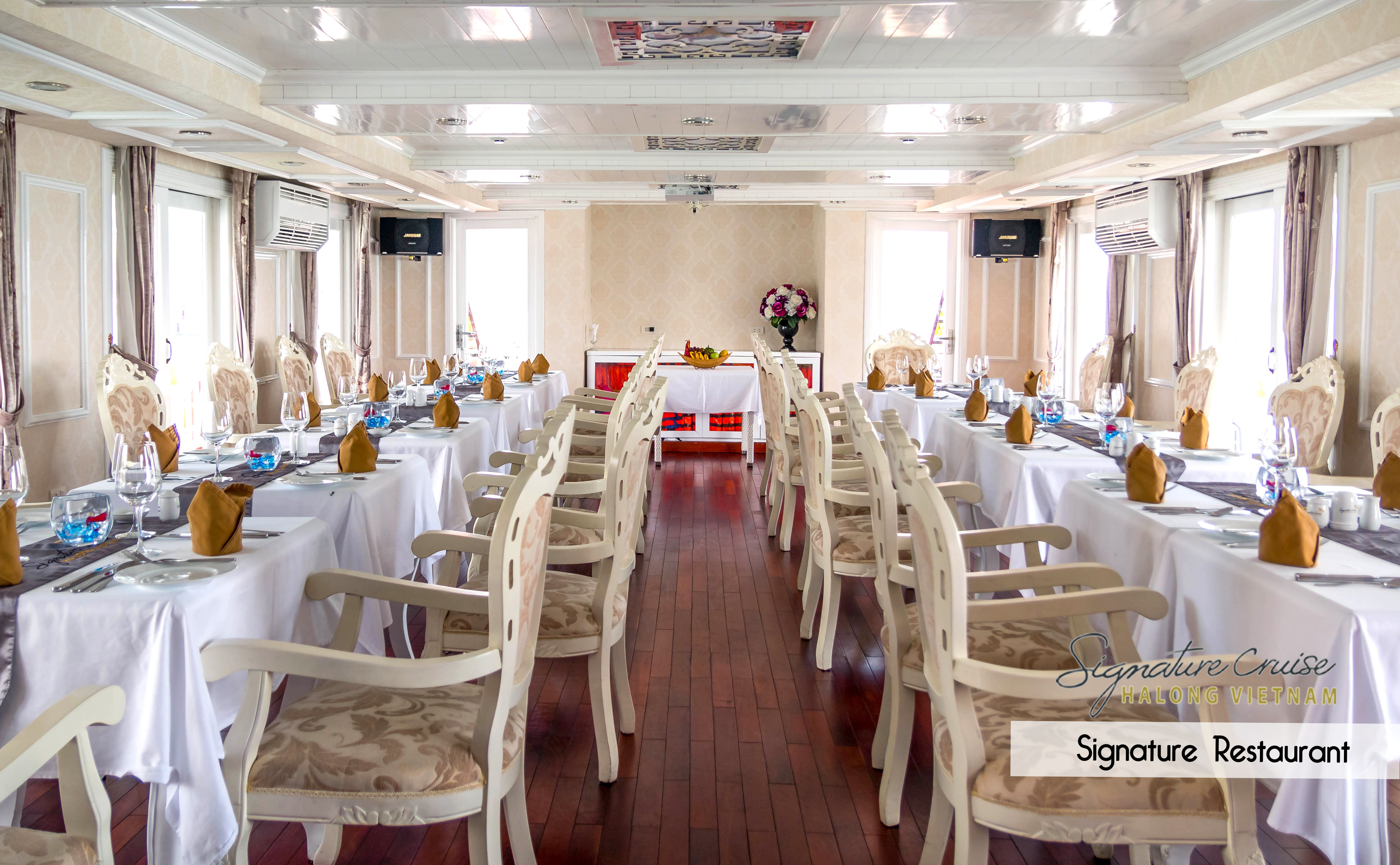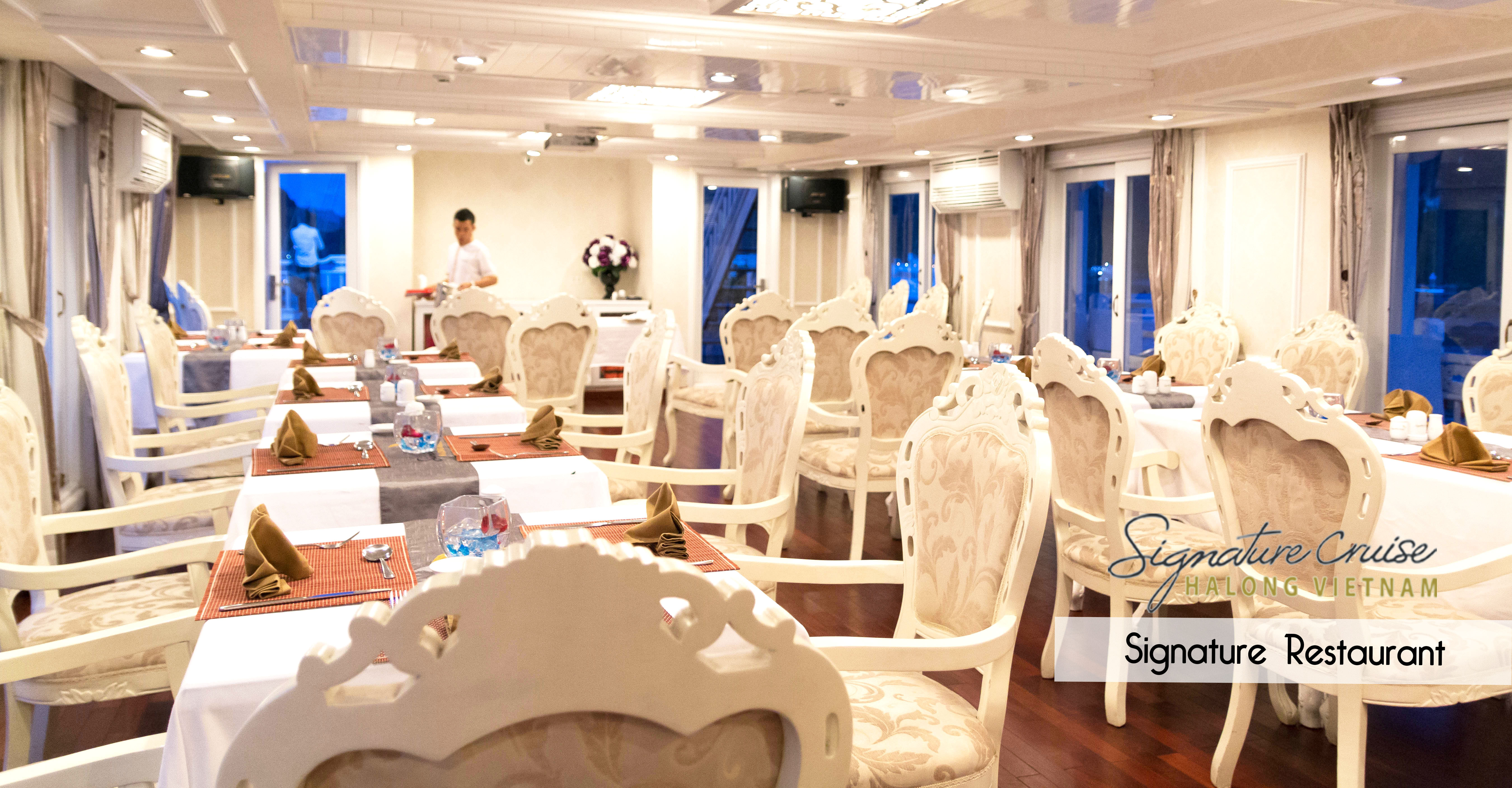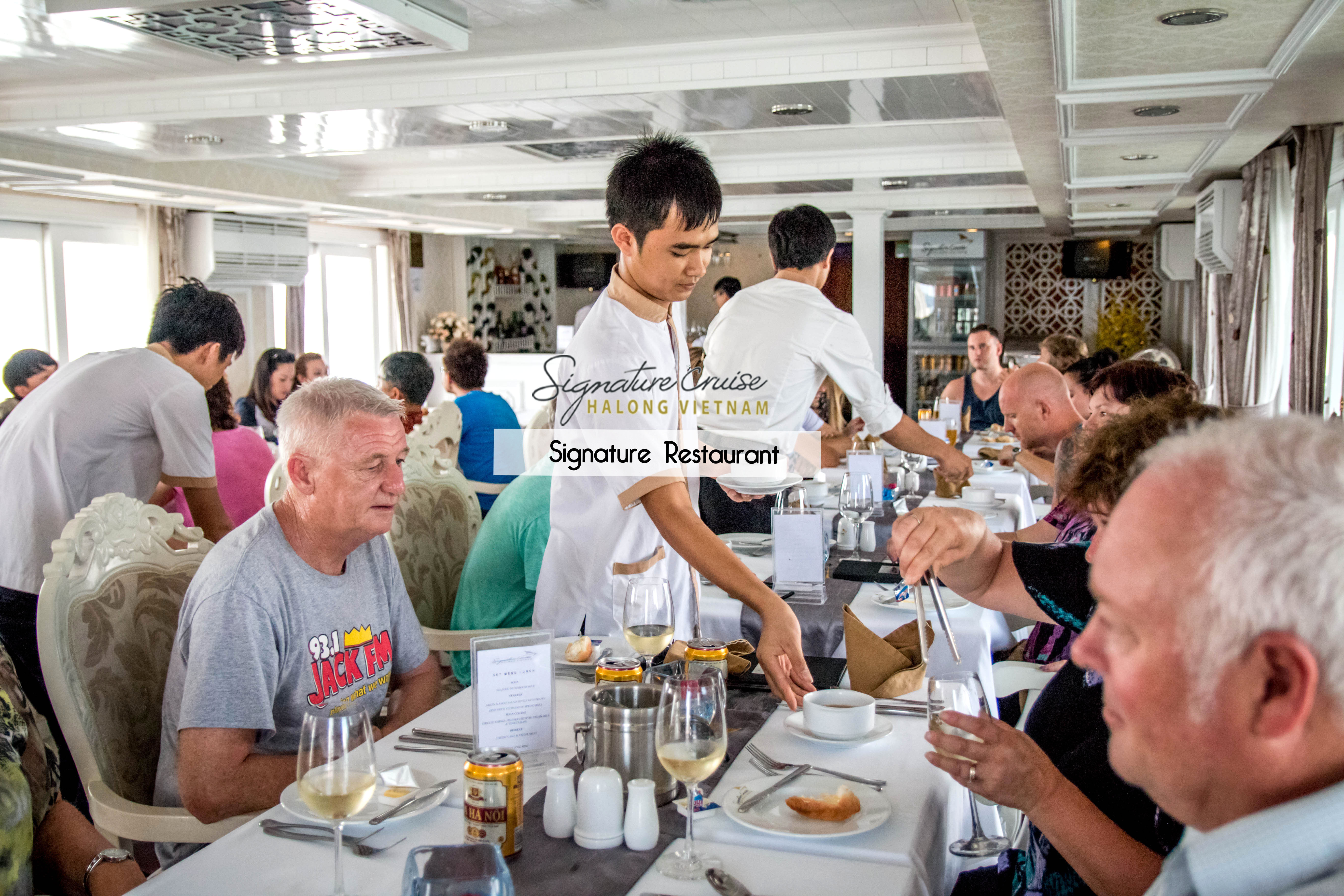 At Signature Halong Cruise, we take pride in offering high-quality facilities and special services to ensure your utmost satisfaction. Prepare to explore the breathtaking landscapes and visit spectacular locations around Halong Bay and Bai Tu Long Bay. Delight your taste buds with tantalizing dishes prepared by our skilled chef and culinary team, featuring fresh seafood, delicious Vietnamese specialties, and international cuisine.