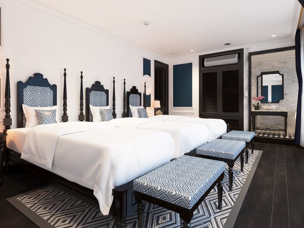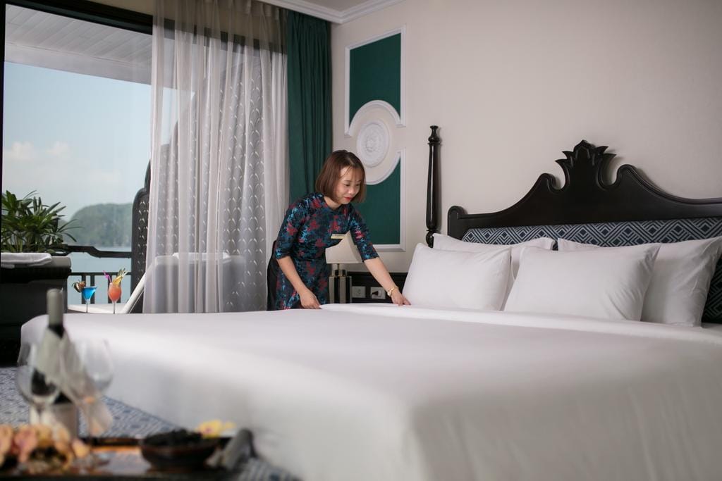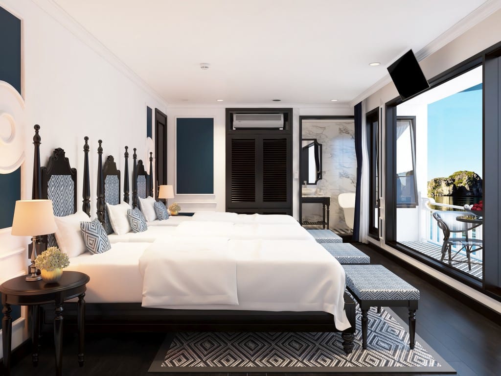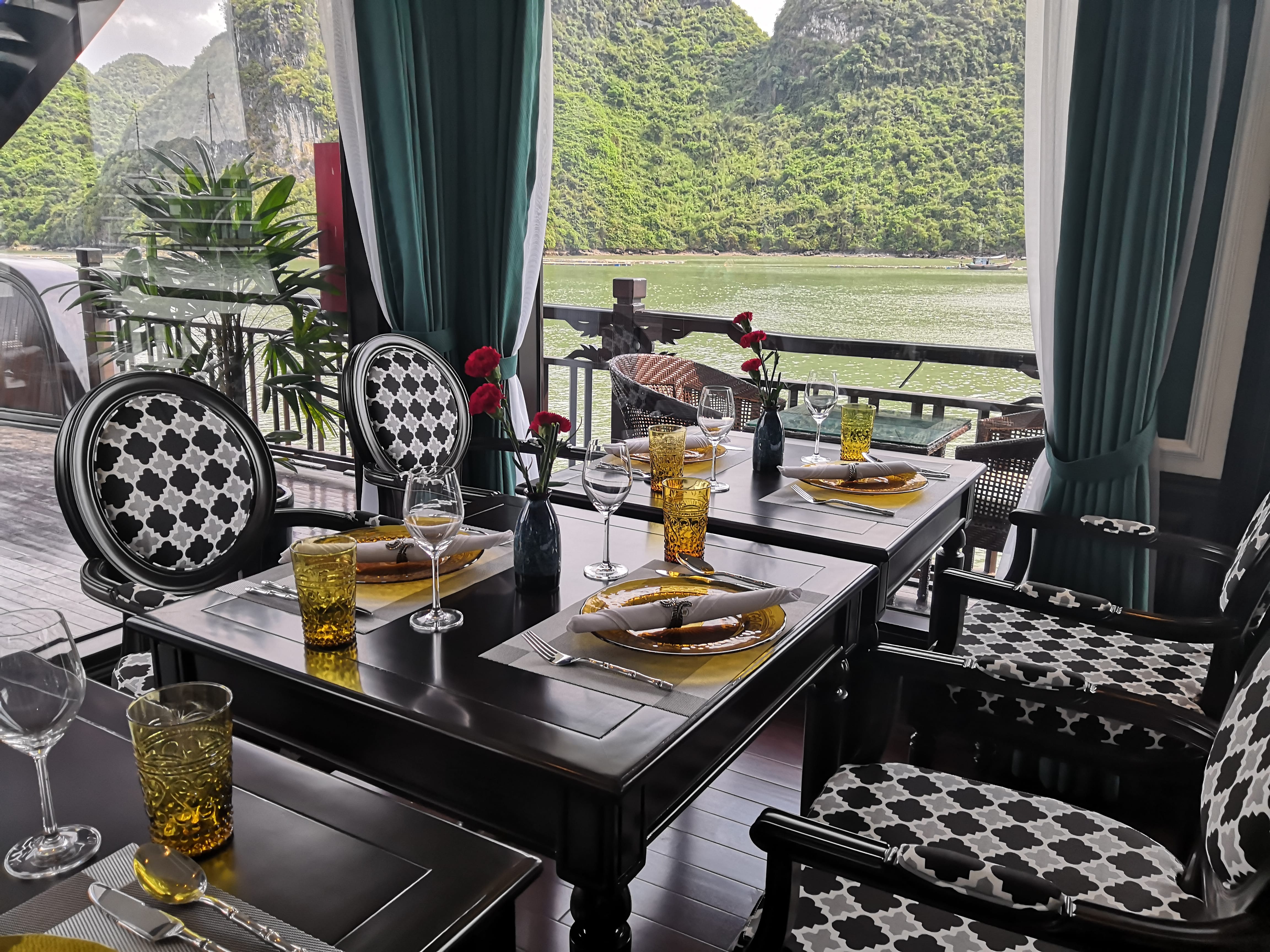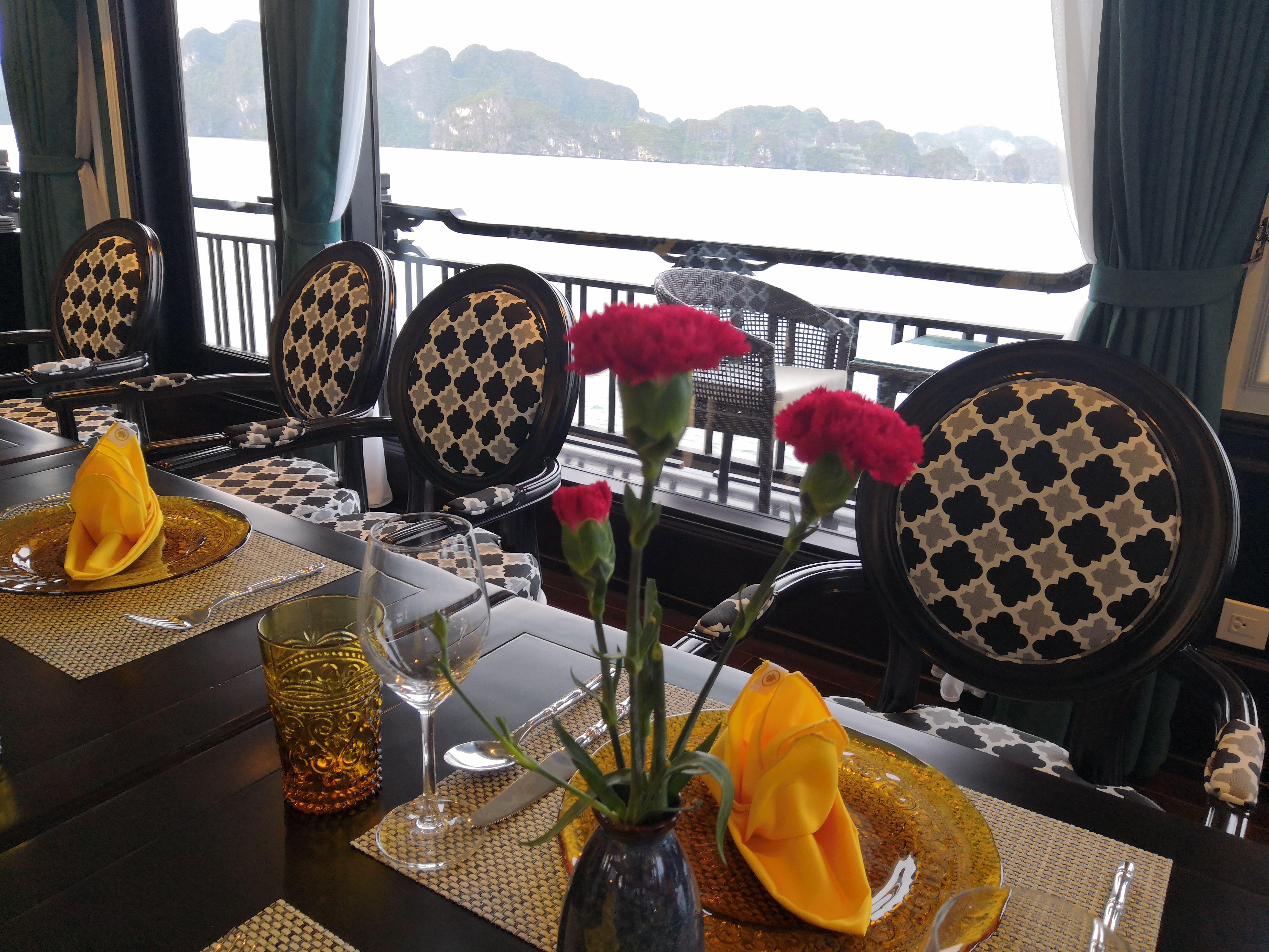 The Genesis Regal Cruise, new 5 star vessels on the bay with ultimately luxurious facilities. Be designed by traditional features, mixing with the luxury of neoclassic concept and inspired by the royal elegance of the French-Indochine style. With the amount of 20 bedrooms on a cruise, with a variety of room options as suites for the couple, family suites, connecting suites, regal terrace suites…that could cater well for all personal demand. All rooms are designed and equipped with private balcony, en-suite bathtub, full-frame windows, safety box, full HD satellite television along with detailed utilities and traditional meticulous decoration.