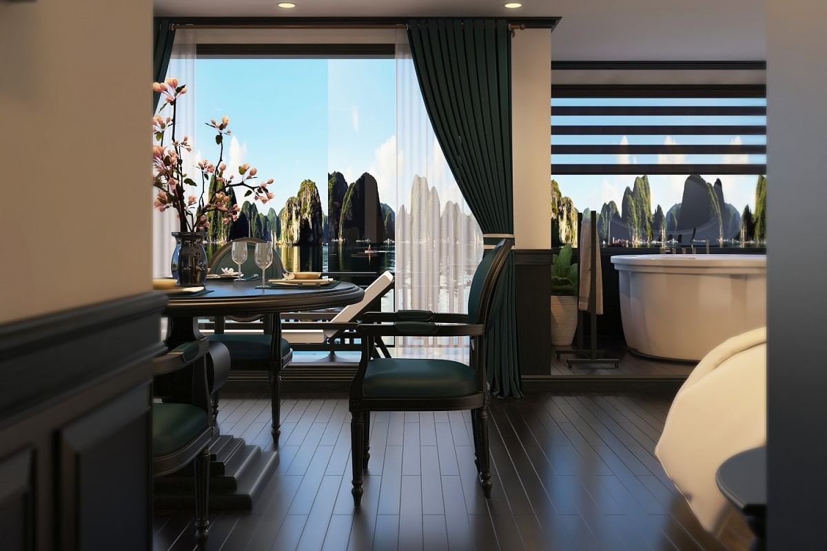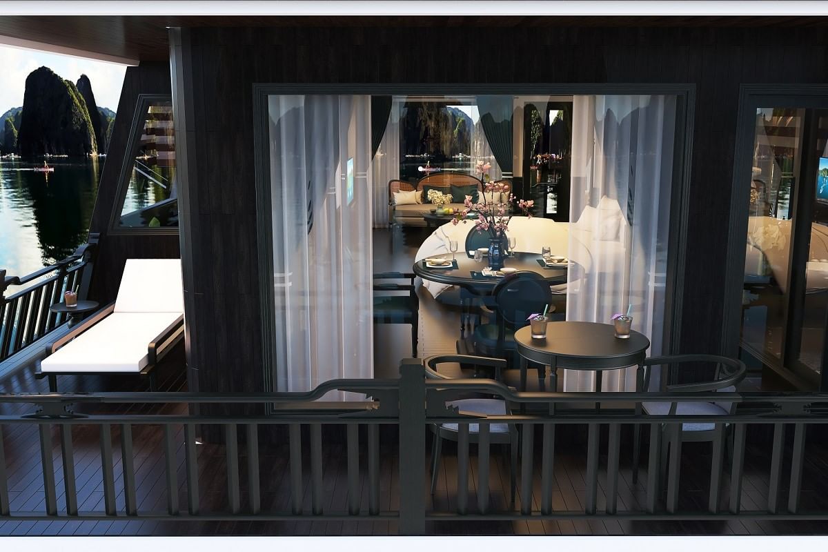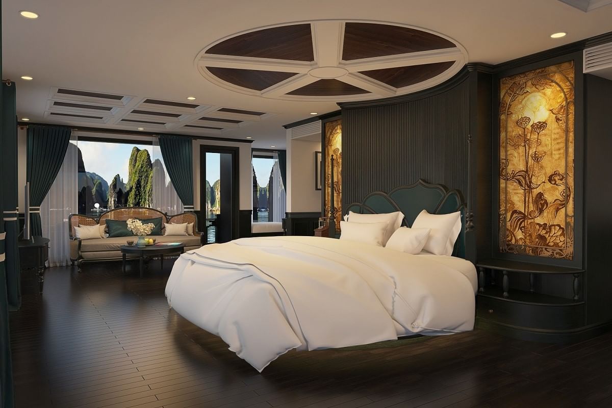 Designed with a nod to the colonial Indochina 1930 style, La Regina Grand features a sophisticated and comfortable ambiance. With 27 spacious, air-conditioned suite cabins boasting full-length windows and private balconies, the cruise offers a spectacular panorama of Lan Ha Bay's picturesque seascape. Our well-trained staff ensures gracious and attentive service. Each suite is a tranquil retreat, blending timeless elegance with modern conveniences and luxuries.