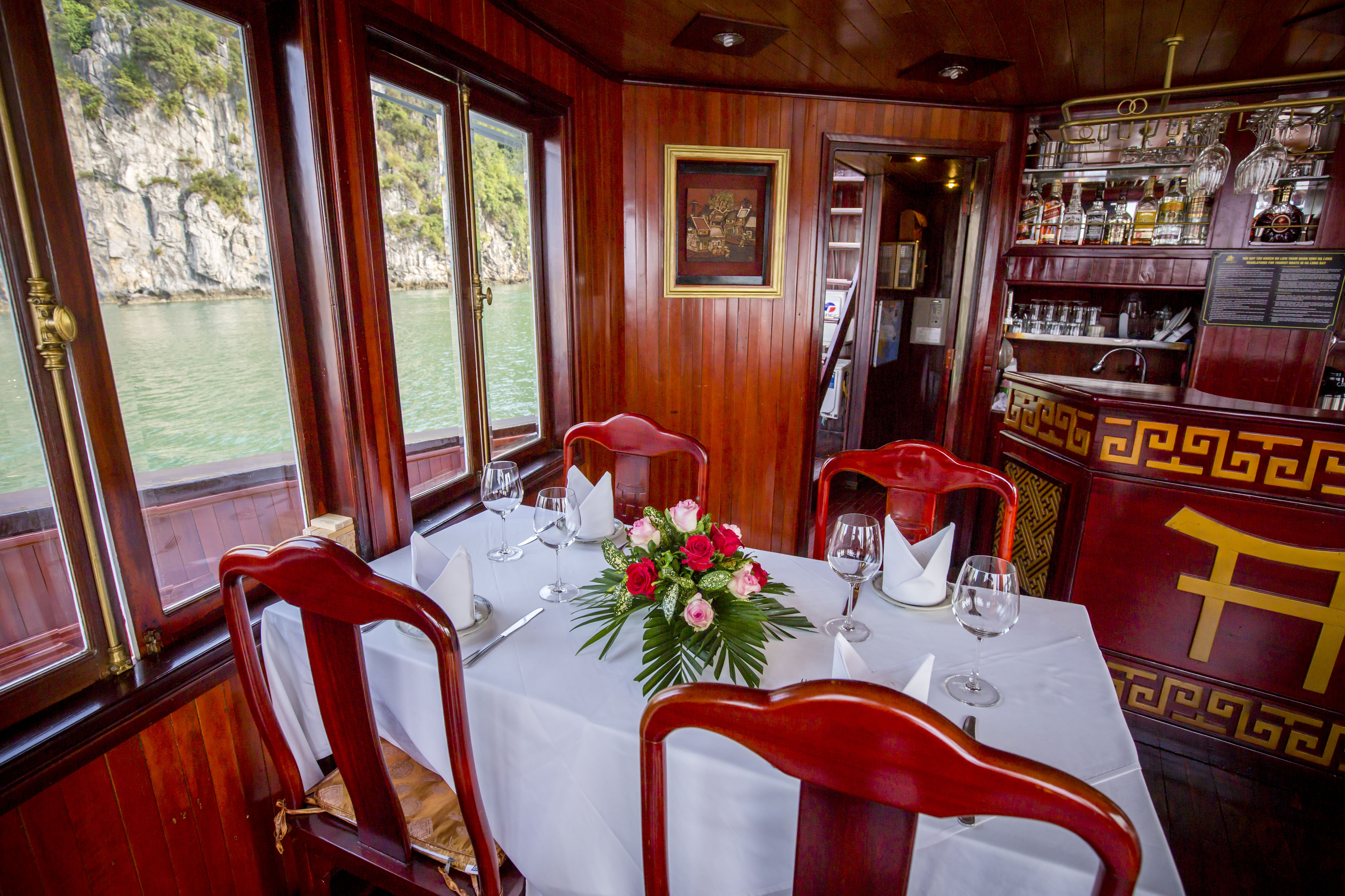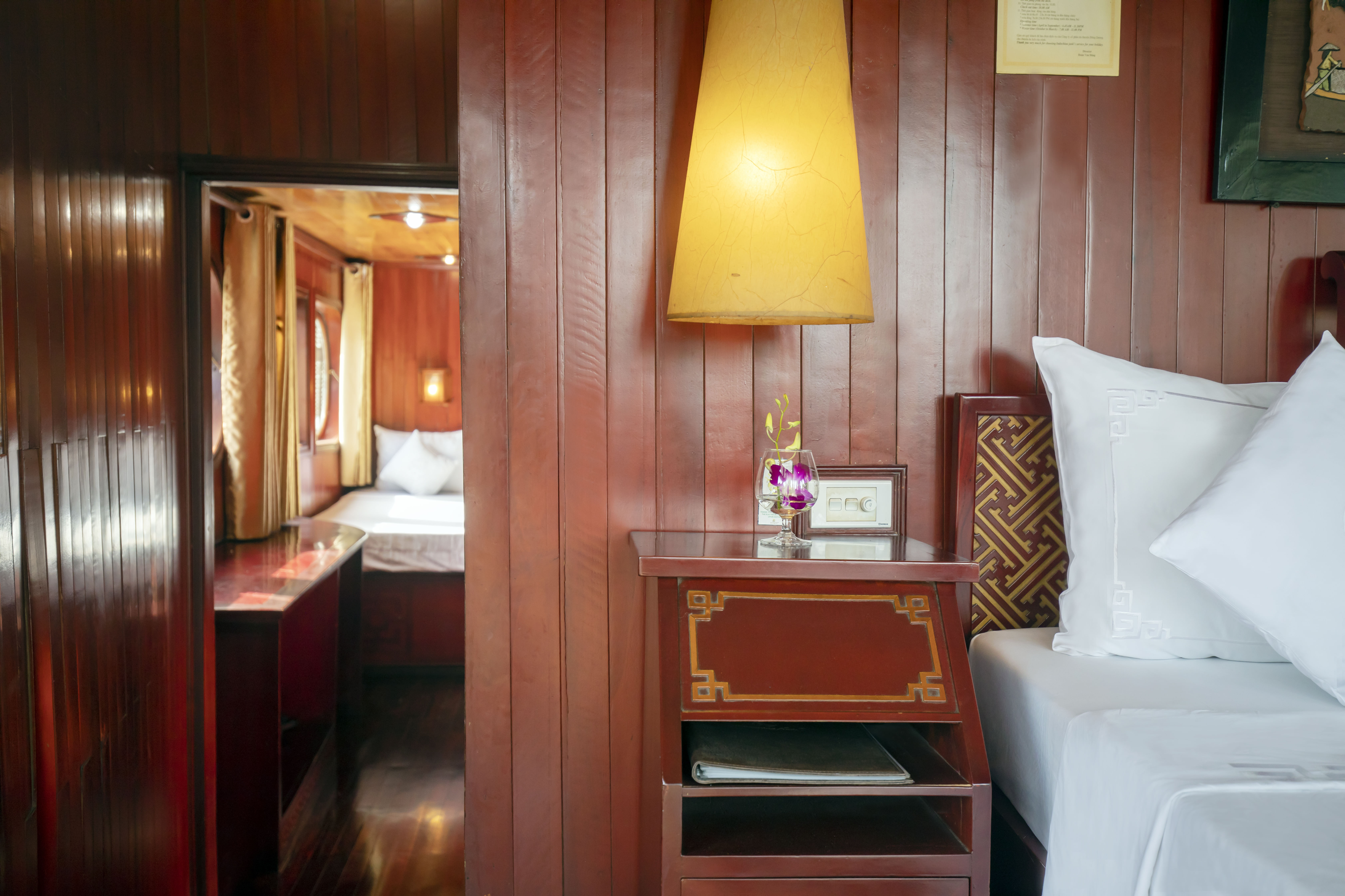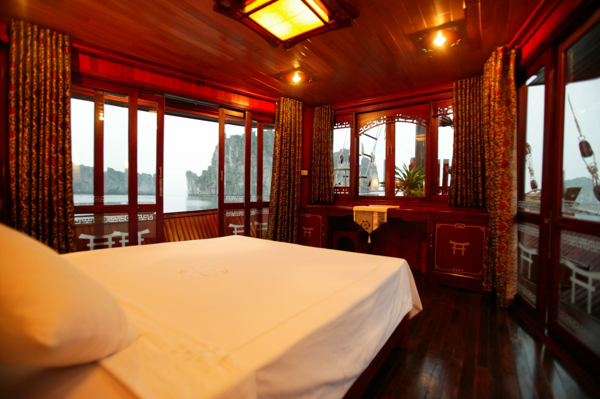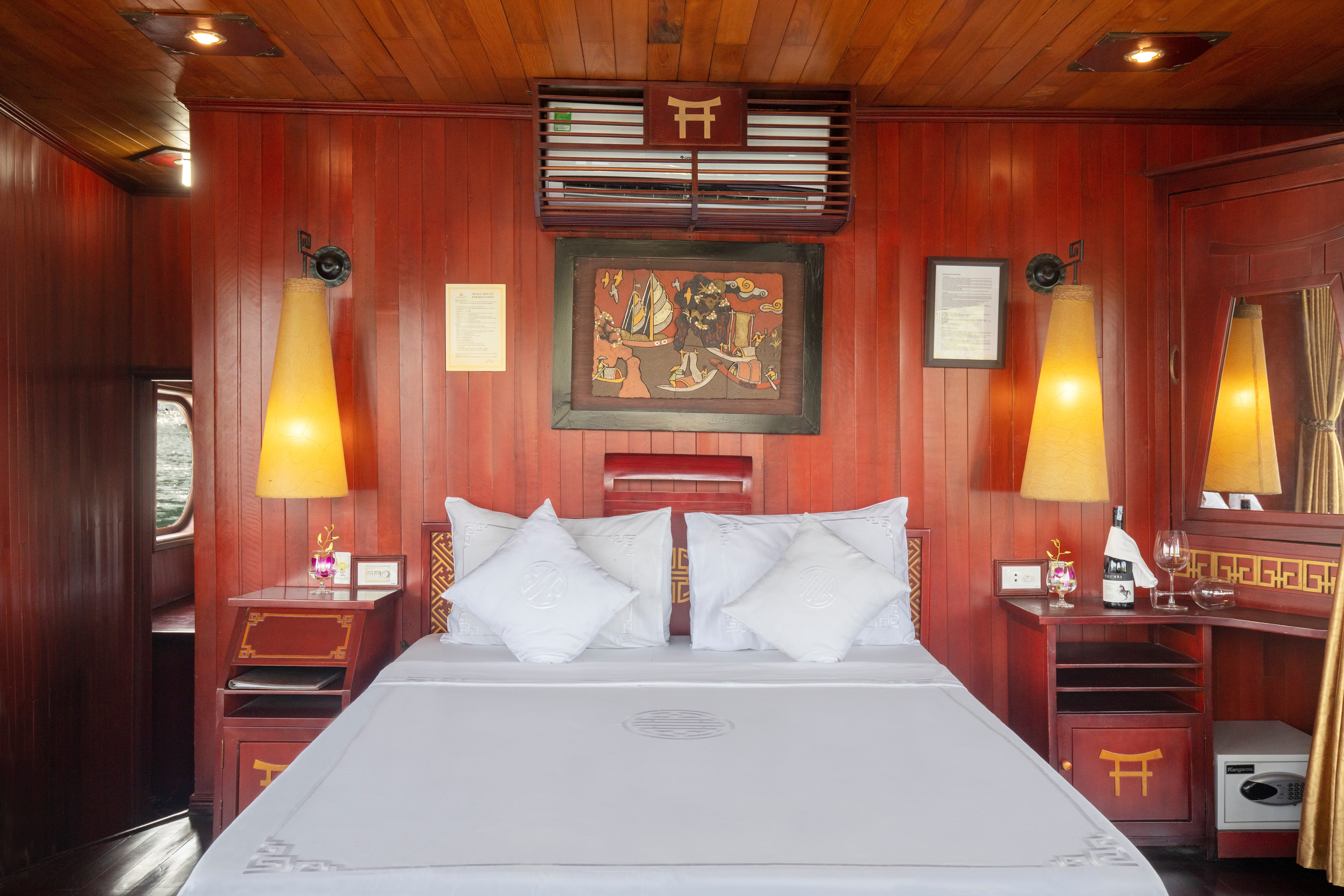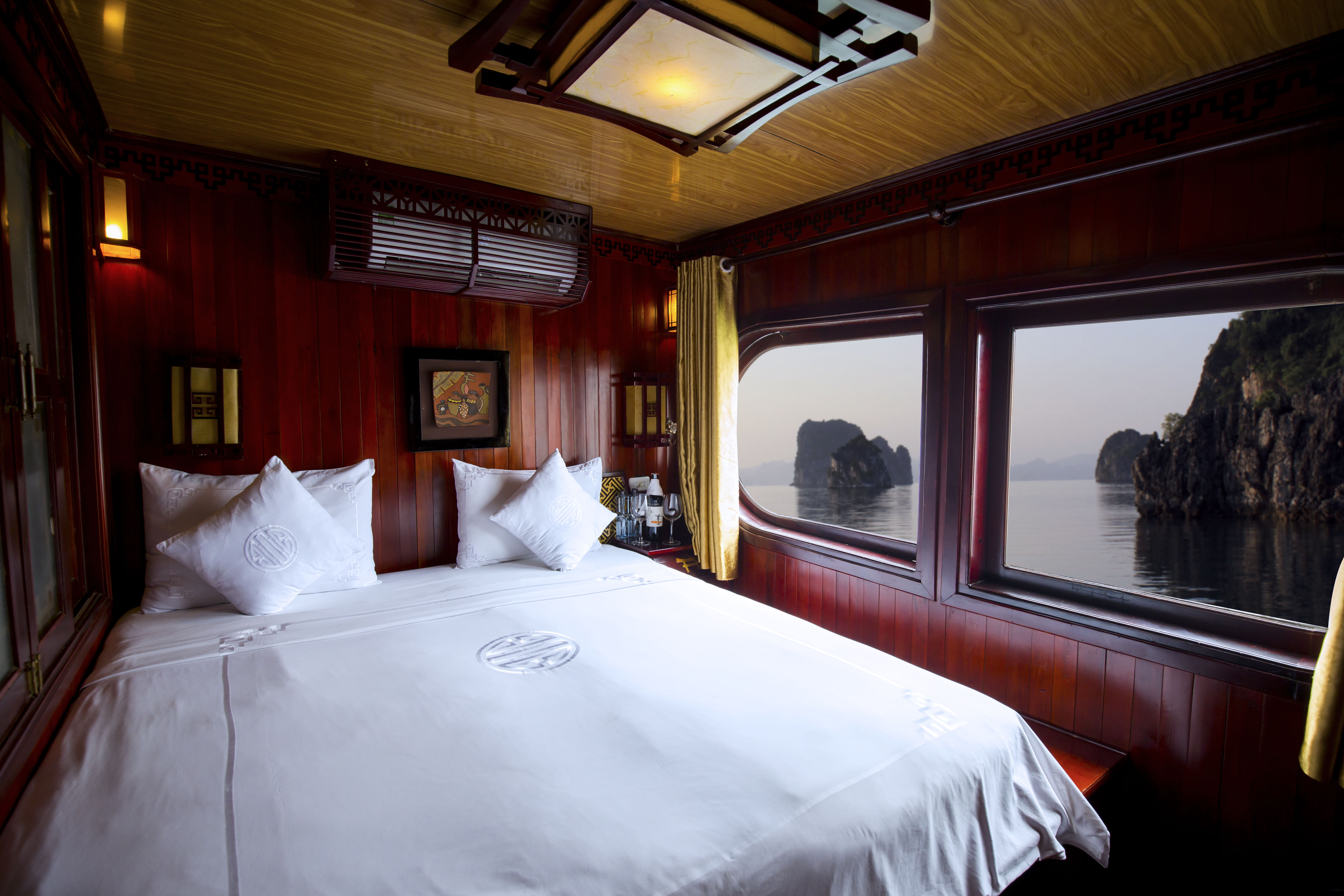 • Authentic Experience: Immerse yourself in the rich culture and traditions of Vietnam with our traditional wooden boats and oriental-designed cabins, complete with large windows and en-suite bathrooms.