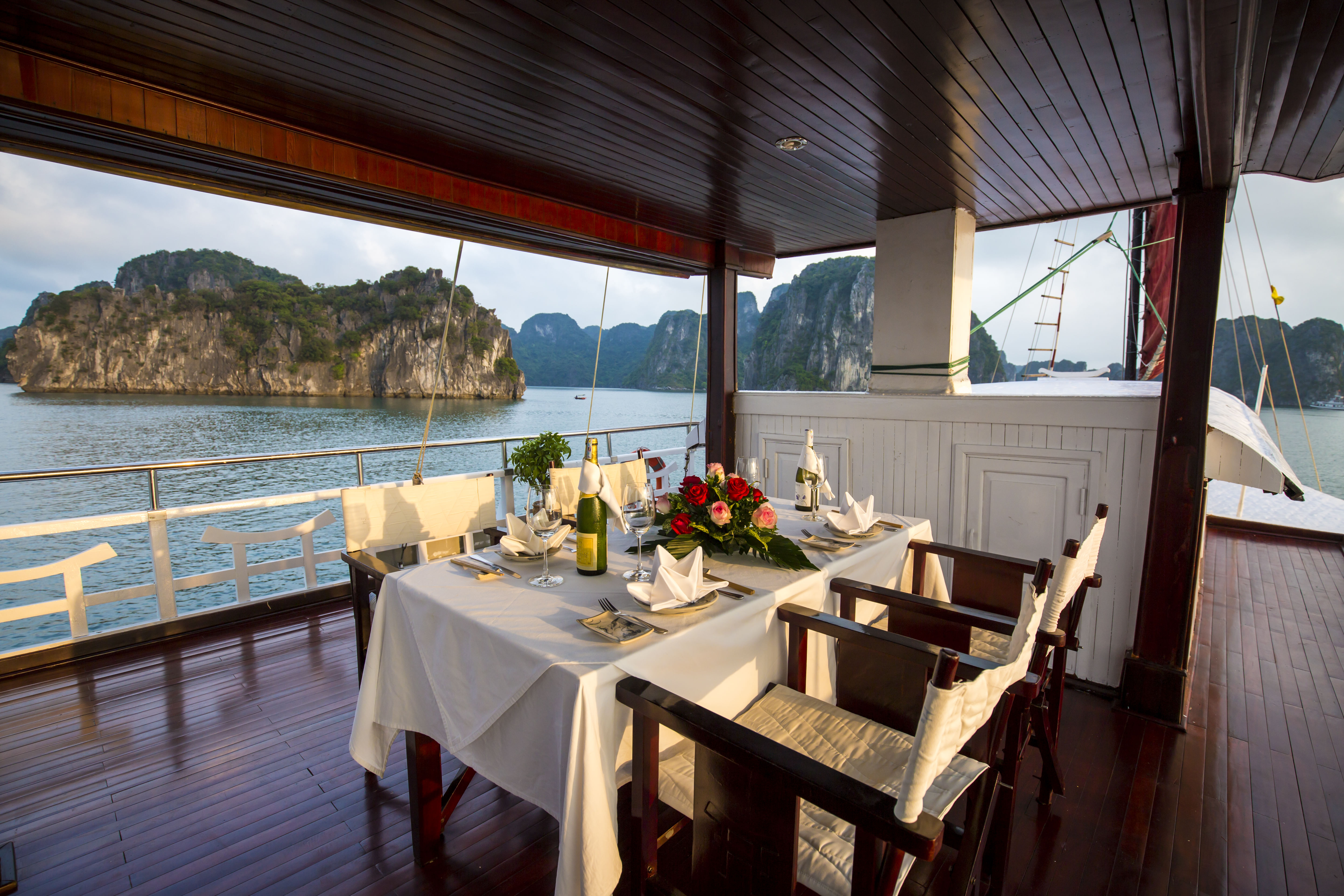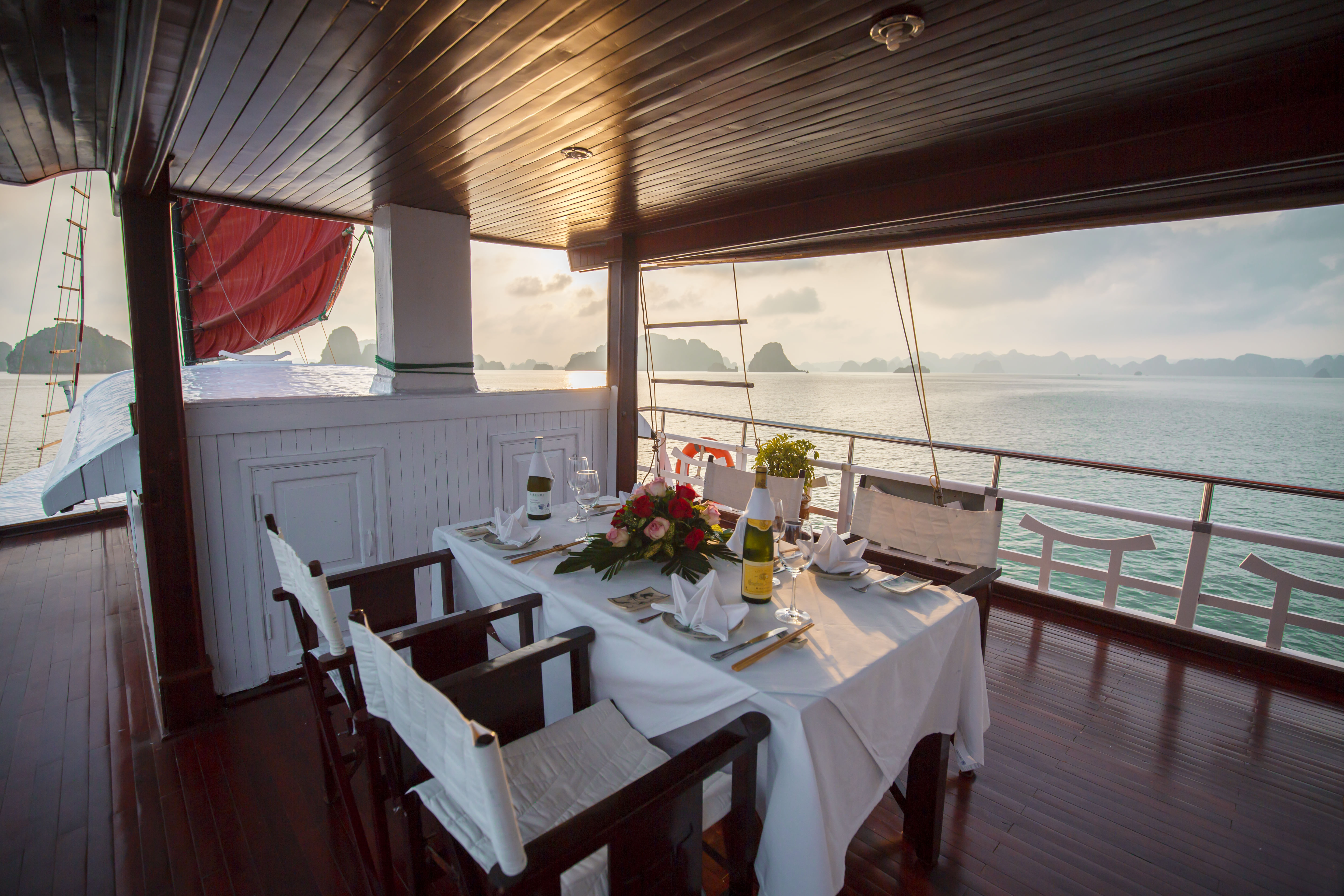 Crafted after the traditional fishing boats of Halong Bay, the Prince Junk boasts sophisticated design and meticulous attention to detail. With four cabins and two decks featuring indoor and outdoor dining areas, our junk offers the perfect blend of elegance and comfort.
