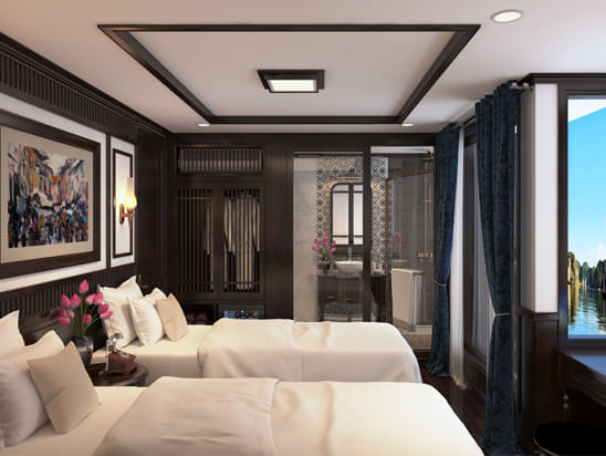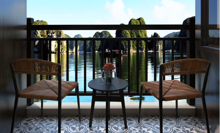 • Luxury En-suite Bathroom Cabin with Private Balcony: Guests are accommodated in luxurious en-suite cabins equipped with private balconies, providing a comfortable and relaxing space to enjoy the stunning views of Halong Bay - Lan Ha Bay.