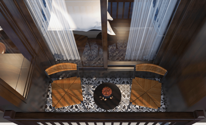 3. Terrace Cabin: Size: 40m2. Location: Second Floor. Features: Balcony, Double bed + Single Bed.