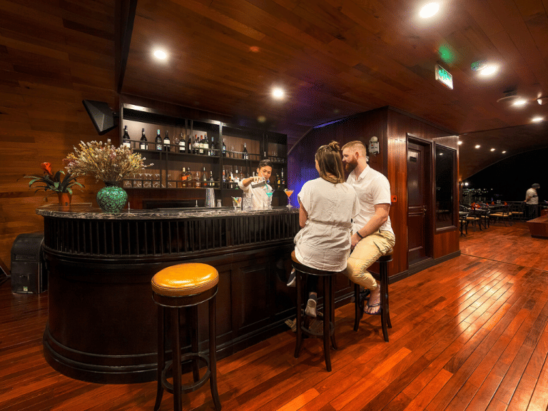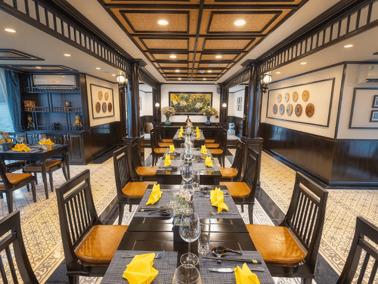• All Meals on Board: Guests are provided with all meals during the cruise, including 2 lunches, 1 dinner, and 1 breakfast. The meals showcase a variety of delicious Vietnamese and international dishes prepared with fresh ingredients.